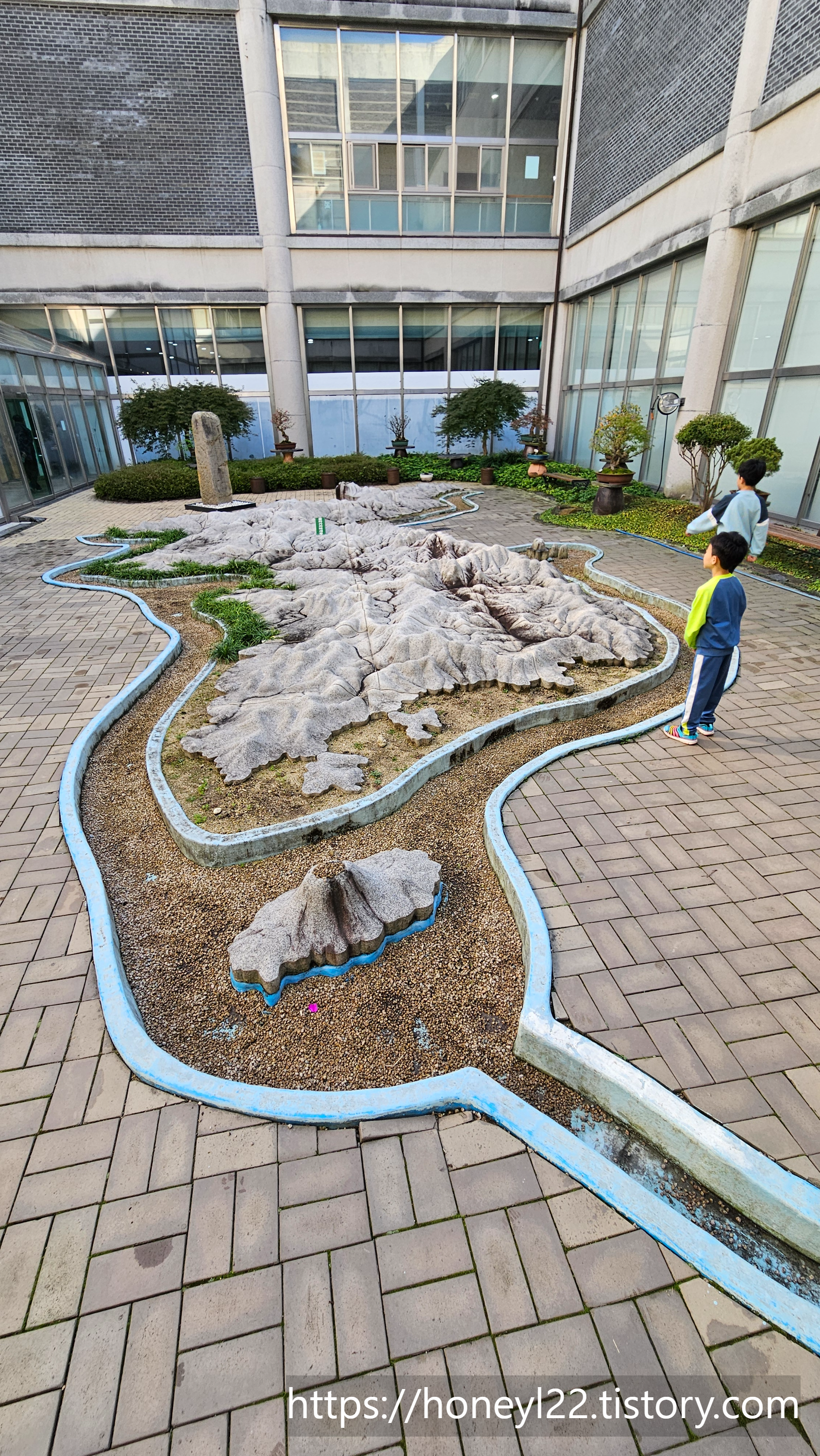 박물관의 중앙정원 같은 공간에 만들어진 이 한반도 모형 분수(?)는 가까이에서 보는 것도 참 멋져요. 백두대간의 모습을 실감 있게 표현해 두어서 아이들이 보면서 신기해했답니다. 저도 뭔가 우리나라의 뼈대를 본 것 같은 기분이었어요.