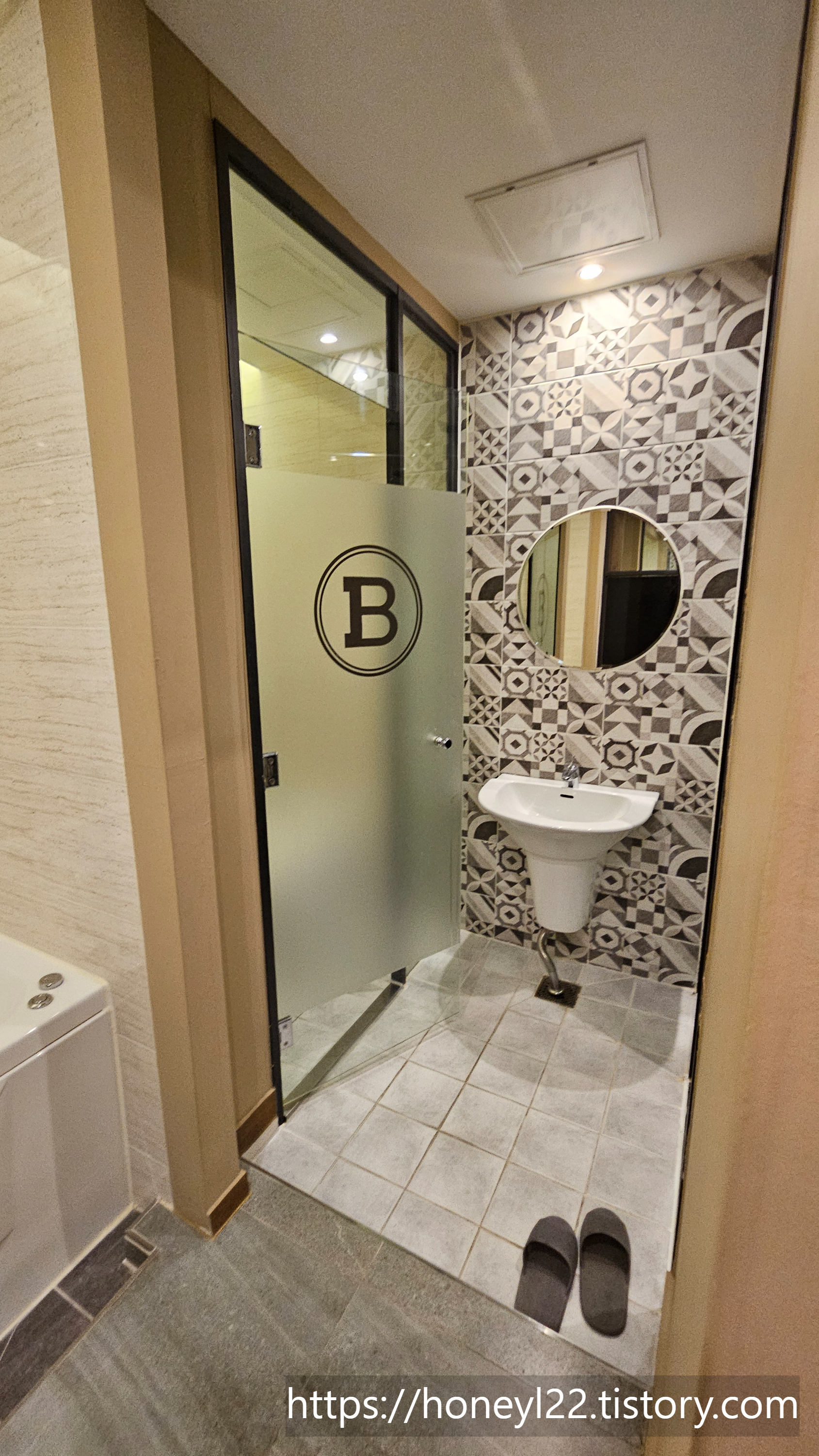 세면대와 오픈형 행거가 욕조 진입 전에 놓여 있어서 손만 씻을 때는 이 공간을 이용하면 편하고, 씻거나 볼일을 봐야 할 때는 따로 안쪽에 있는 샤워부스나 화장실을 이용할 수 있는데 센스 있게 양쪽 공간 가운데에 세면대가 또 있었어요.