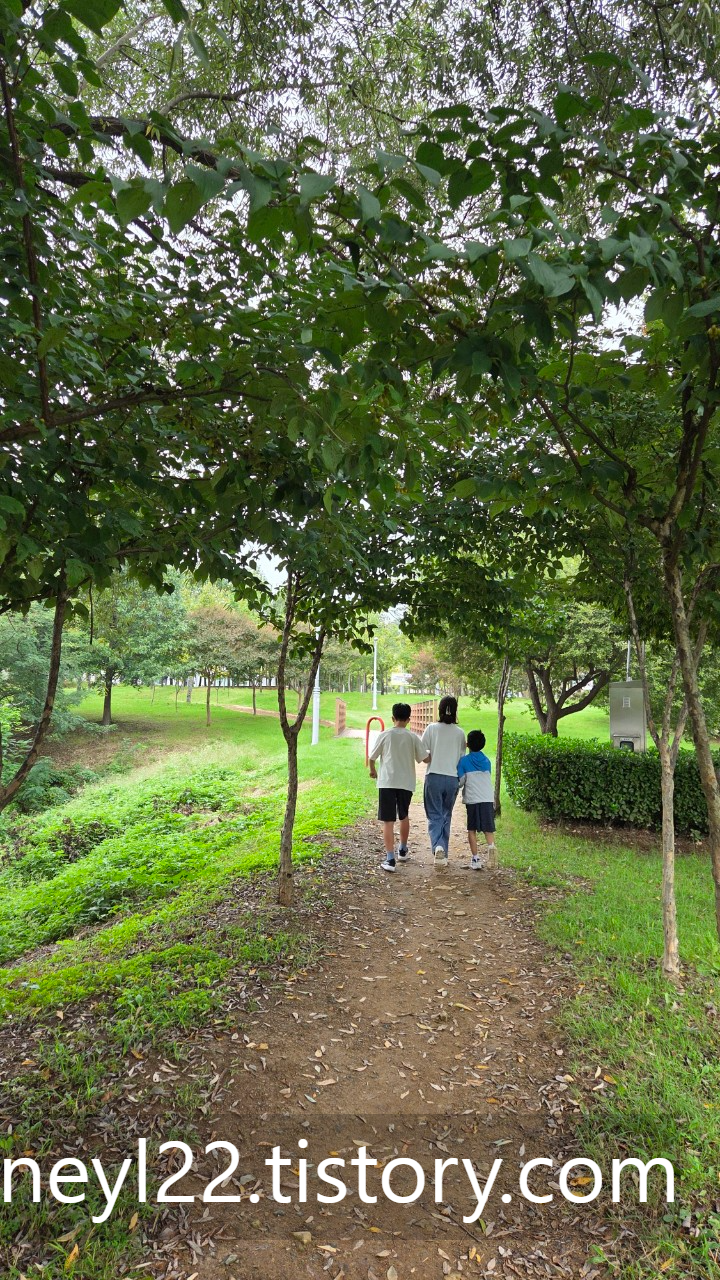 Slowly, I took a walk along the trail along the reservoir. The day before, the children traveled for a long time by car, so they ran excitedly and then walked again and took a walk in the park. They also experienced exercise equipment installed on one side of the park once in a while.
