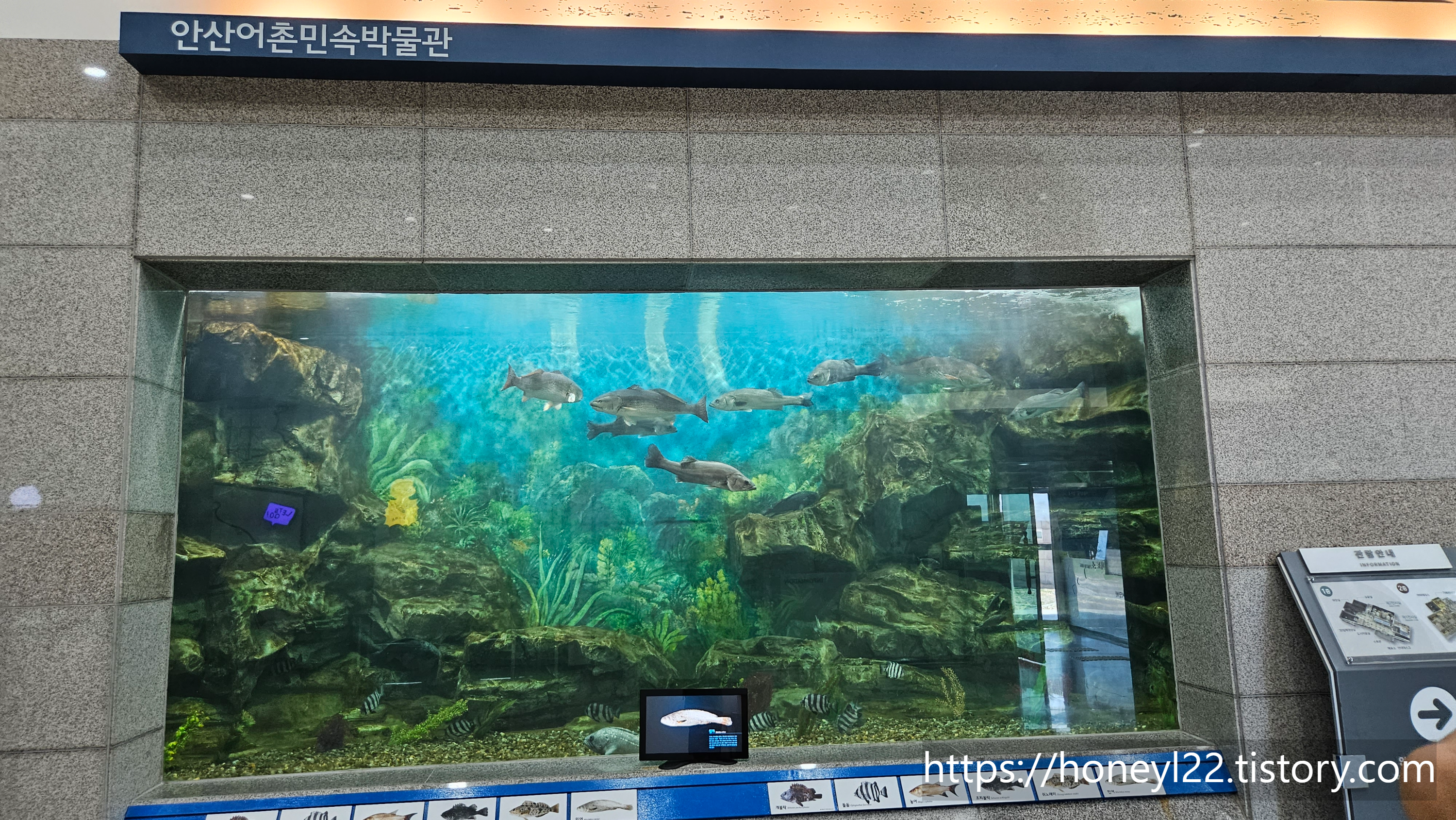 대부도도 섬이라서 바다에 와 있다는 건 체감할 수 있었지만 이 곳은 바로 옆이 항구여서 그런지 바다내음이 더 진하게 공기 중에 퍼져 있는 것 같았습니다. 더위에 등 떠밀려 박물관으로 서둘러 입장했습니다. 입장하자마자 로비에서 방문객을 맞아주는 건 거대한 수조였어요. 작은 상어가 헤엄치는 수조를 아이들은 신기해하며 바라봤어요. 잠시지만 로비의 수조 덕분에 저는 아쿠아리움에 온 듯한 기분을 만끽했습니다.