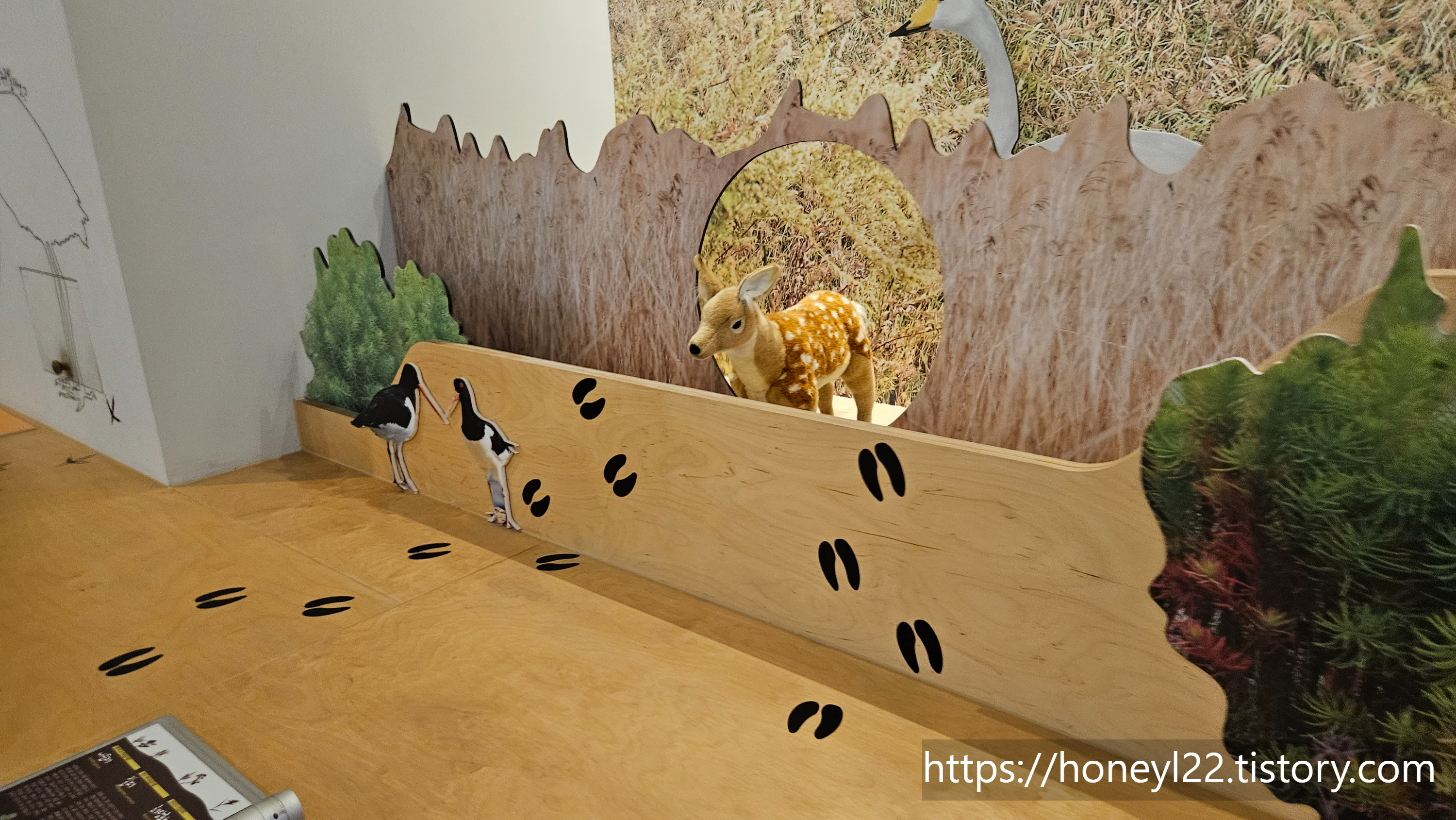 1층에는 1 전시실과 2 전시실이 있는데 1전시실에는 인근의 생태계를 이루는 구성원들을 볼 수 있는 전시실이었어요. 조개부터 동물들까지 다양한 생물들을 볼 수 있었는데 동물들이 박제가 아닌 인형이 있어서 어딘지 정감이 있었습니다.