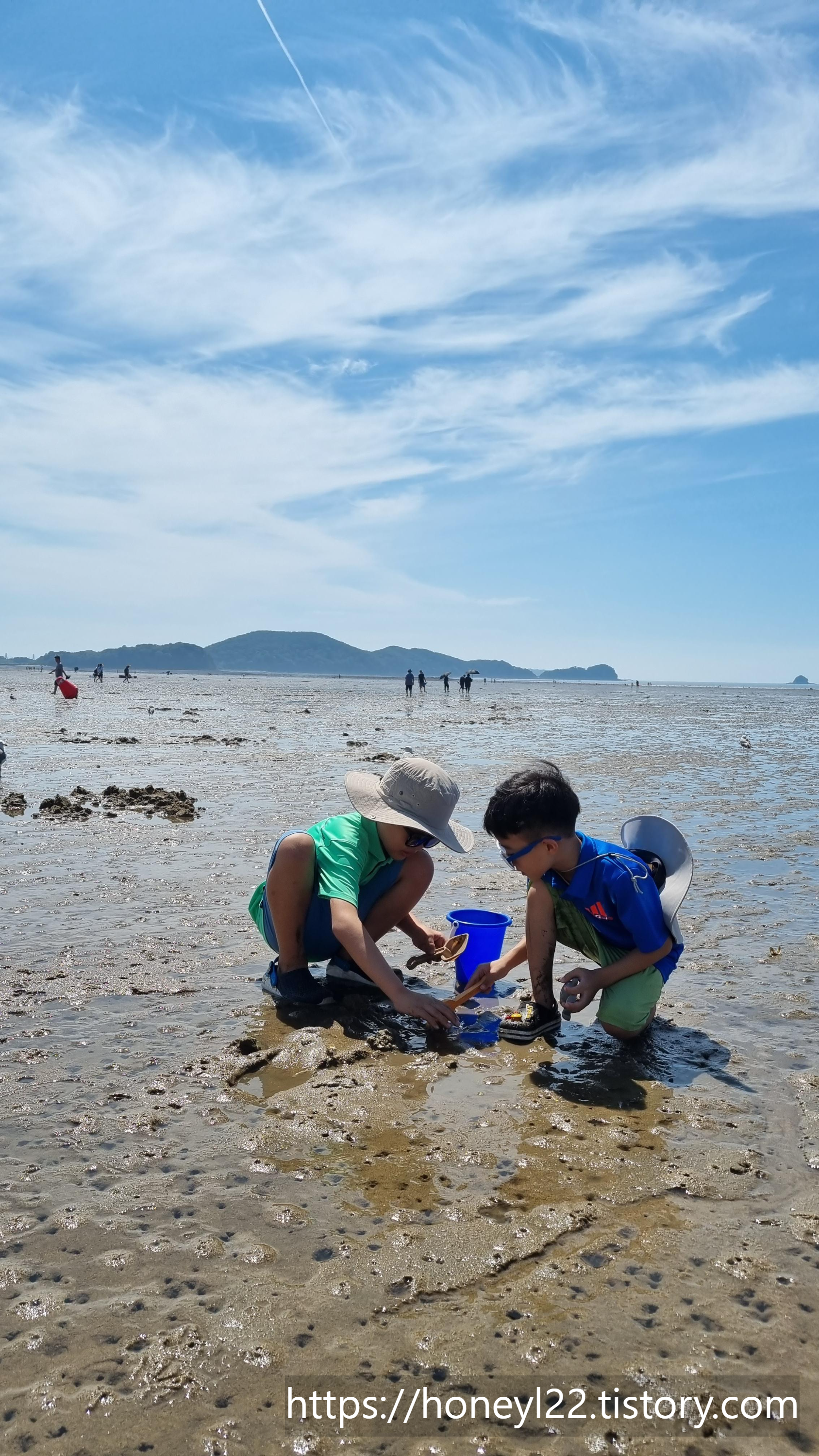 제가 도착했을 때가 2시즈음 이었는데, 만조가 멀어서 바닷물이 저 멀리까지 빠져 있었어요. 앞에 펼쳐진 뻘에는 게가 마구 돌아다녔어요. 아이들은 홀린 듯이 바다로 바다로 향해갔습니다. 이 때는 해수욕을 할 생각이 전혀 없어서 옷을 입고 아이들이 갯벌에서만 놀기를 바랐답니다.