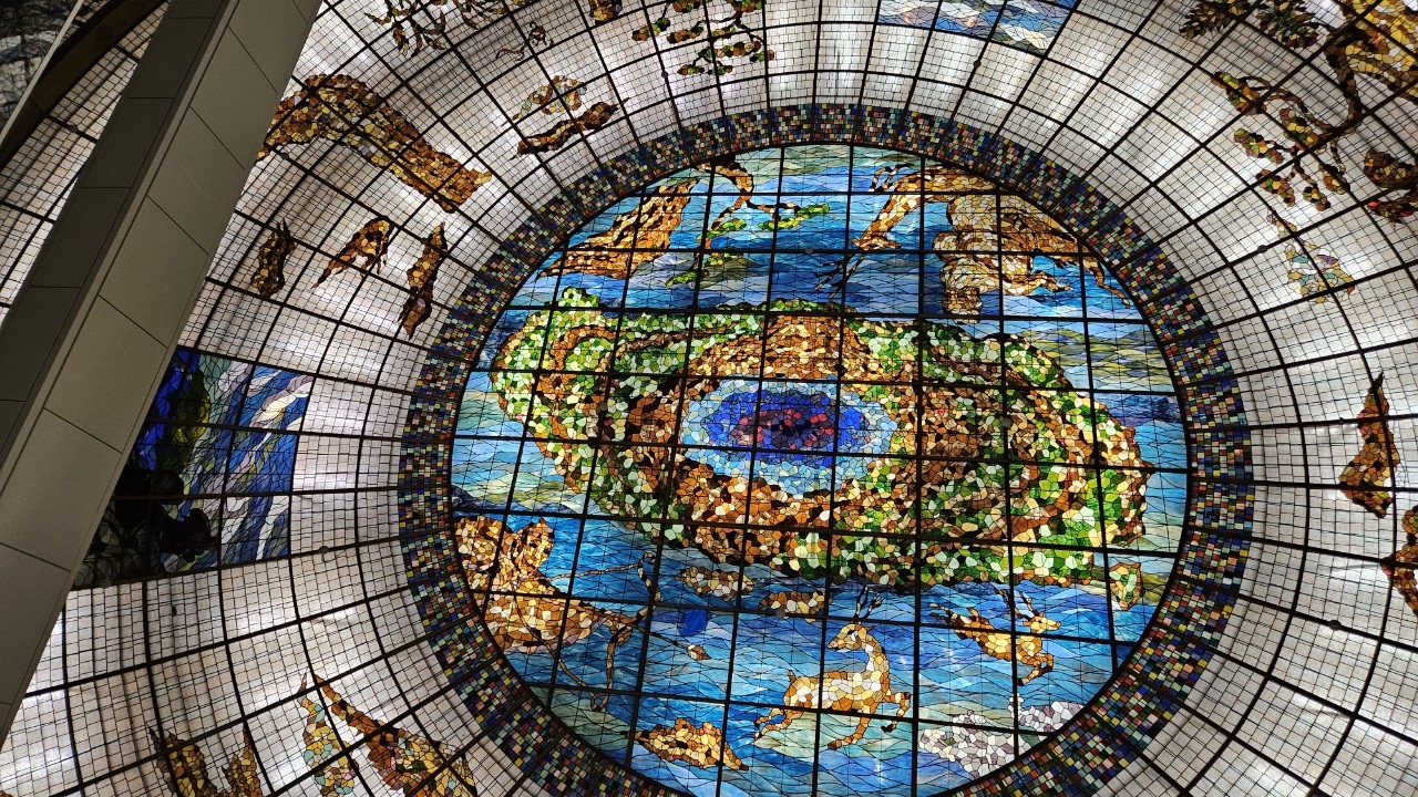 제주 국립박물관의 가장 인상깊은 전시물이 뭐냐고 묻는다면 저는 아마도 메인 전시관의 천장에 새겨진 스테인드 글라스 돔을 선택하고 싶습니다. 국립박물관 건물들은 건물 그 자체도 하나의 작품처럼 만들어지는 추세죠. 지금까지 가본 국립박물관들은 대부분 건물에서 받는 분위기가 전체적인 인상을 만들어주는데 큰 역할을 했었습니다.