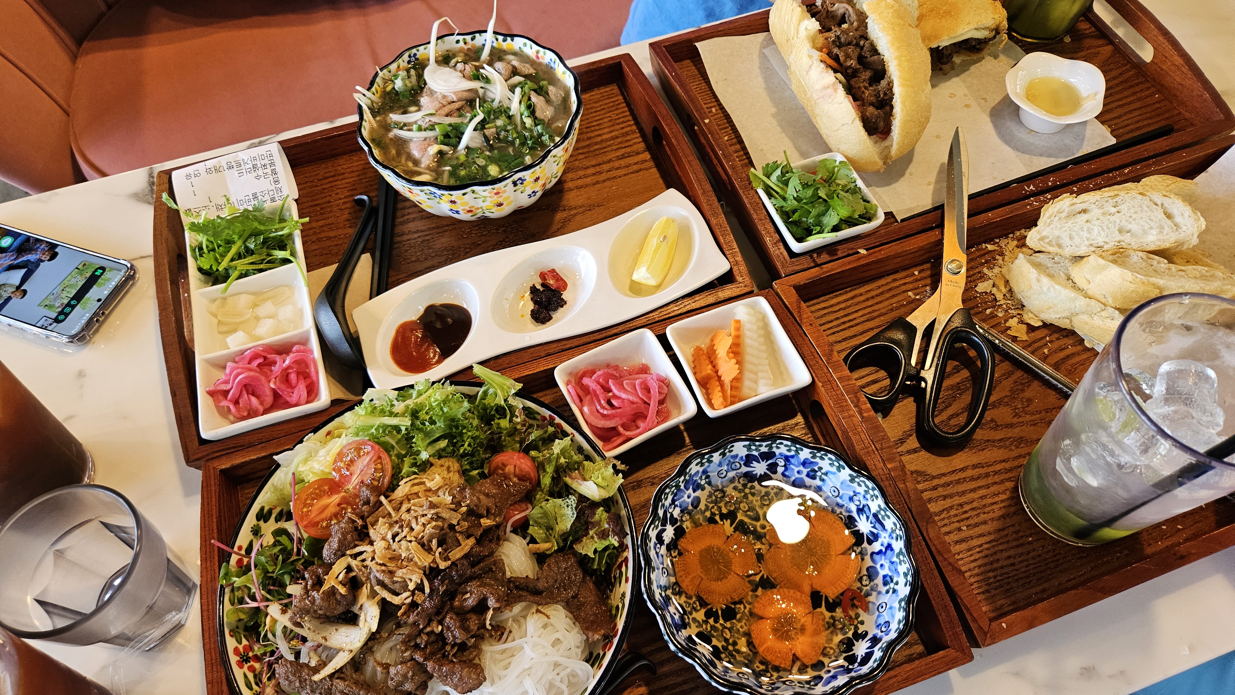 쌀국수, 분짜, 반미 2종류와 바게트세트를 시켰어요. 아이들에게 음료도 주문해줬는데 트레이 4개를 내려놓으니 더는 공간이 없었습니다. 먹고 싶은 건 다 시켜본 것 같은데 여기 분짜 맛있었어요. 쌀국수도 평균이상의 맛이에요. 반미는 평범한 맛이에요. 고기가 맛있었으면 더 좋았을 거예요.