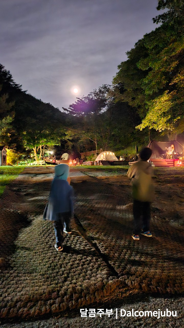 캠핑의 아름다움은 어둑해지는 시간에 더욱 빛이 납니다. 도심에서 화려한 불빛 가득한 가운데 지내는 밤이랑 달리 어둑한 곳에서 작은 불빛들이 어둠을 밝히는 모습은 색다른 아름다움을 선사하죠. 제가 갔던 날은 보름달이 환하게 비춰줘서 달구경을 하며 밤 산책을 했어요. 산책하며 바라본 고요한 캠핑장이 예뻐서 다시 한번 캠핑의 매력에 푹 빠져버렸죠.