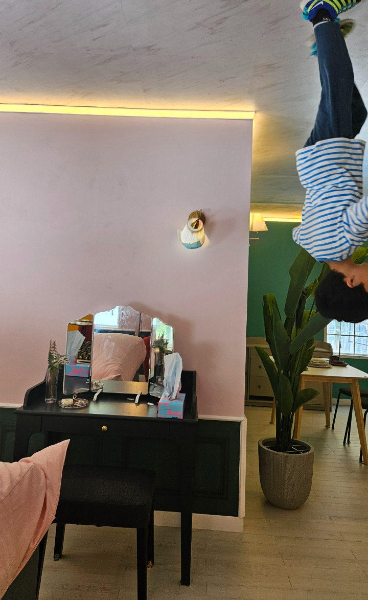 현실에서는 모든 게 천장에 붙어 있는 상황이라서 그걸 보는 것도 신기한 일이었어요. 아이들에게 사진을 직접 보여주지 않고 말로만 이런 곳이 있다고 설명해 주었는데 아이들이 대체 어떤 것들이 위쪽에 붙여져 있을지 상상하면서 가봤거든요. 둘째가 직접본 모습이 상상한 것보다 훨씬 더 멋지다며 신나 했어요. 특히 '바닥에 있는 러그를 위에 붙이는 건 어려울 거야. 그렇지?' 그런 말을 했는데 진짜 붙어 있는 걸 보고 신기하다며 이야기를 했습니다.