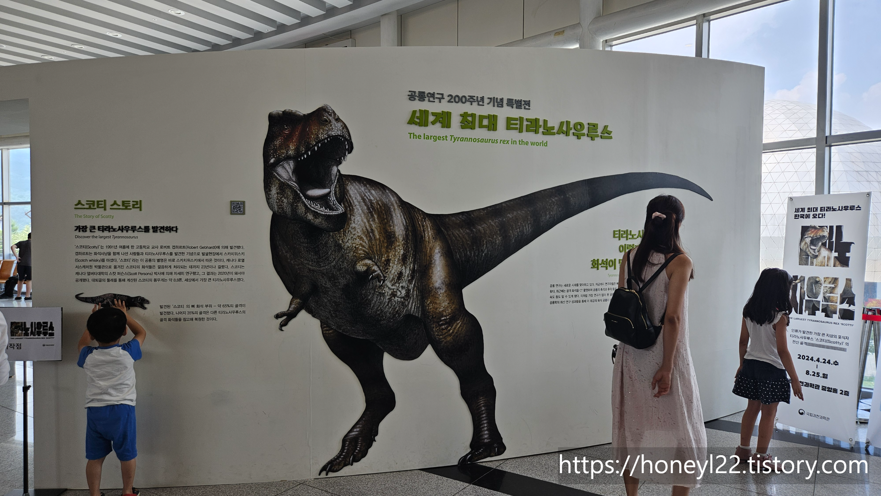 이곳에 설치된 티라노사우르스의 뼈 표본은 실제 사이즈보다 축소된 것일 텐데도 높이가 상당해서 남편이 아이를 안아 들어도 키가 끝까지 닿지 않았어요. 그래도 아이가 까마득히 올려다보던 것과는 다른 시선으로 티라노사우르스의 뼈를 관찰할 수 있어서 신나지 않았을까요?